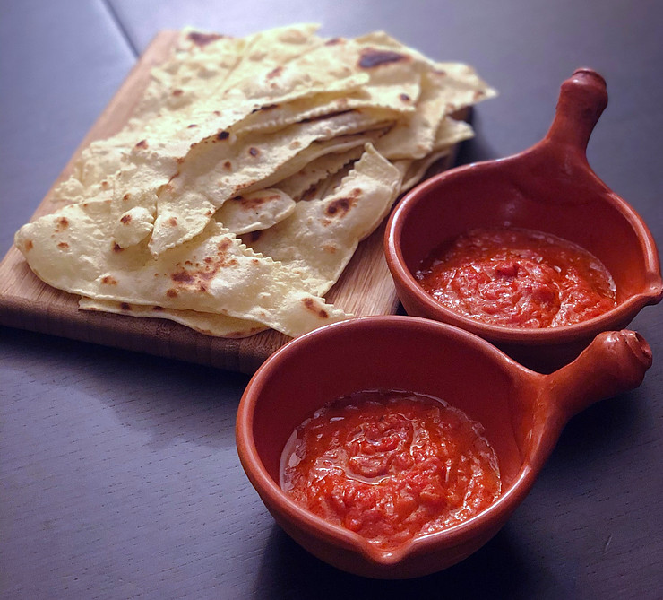 La possiamo mangiare da sola, oppure con pane tostato, crostini, riso o friselle. Mentre se volete consumare la zuppa di pomodoro come fanno gli americani, possiamo accompagnarla con il grilled cheese, tostando del pane con formaggio che fonde, come fosse un toast. Non avendo in casa pane da tostare, ho impastato velocemente della farina, acqua, latte, sale e olio e, dopo aver steso la pasta e tagliata a strisce irregolari, in padella per pochi minuti, ho servito a tavola contemporaneamente.