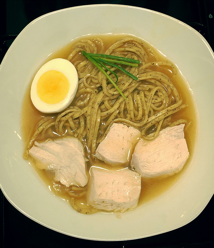 Quella che riporto non è la perfetta ricetta giapponese di ramen, poiché ho sostituito alcuni ingredienti per pigrizia, a dire il vero. Il brodo l’ho fatto di pollo (che avevo già in casa) e non di maiale (ricetta originale) e di conseguenza ho usato il pollo come condimento invece del maiale nella fase dell’impiattamento.