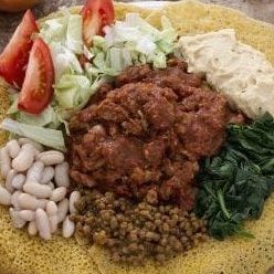 - Se siamo ad esempio in 4, prendiamo un piatto piano grande possibilmente, mettiamo il pane injera come a creare dei petali di un fiori e al centro due cucchiai di spezzatino, intorno posizioniamo tutto il resto, i ceci frullati, l’insalata, i pomodori, le lenticchie, i fagioli, gli spinaci. Serviamo caldo