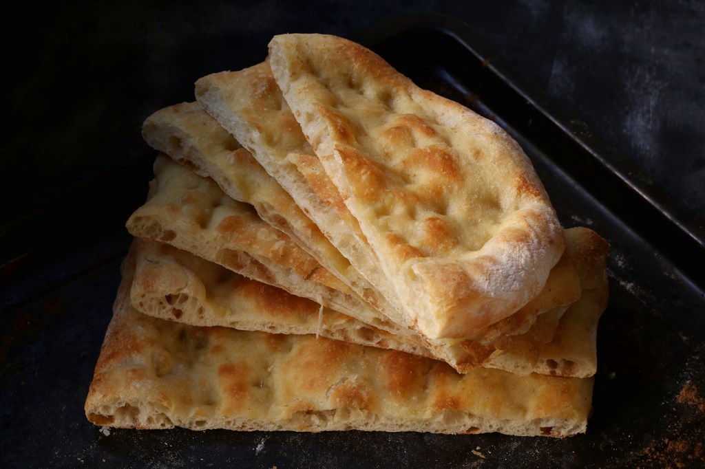 - Ungiamo con olio la teglia e stendiamo l’impasto prima sulla spianatoia infarinata dandogli una forma rettangolare.